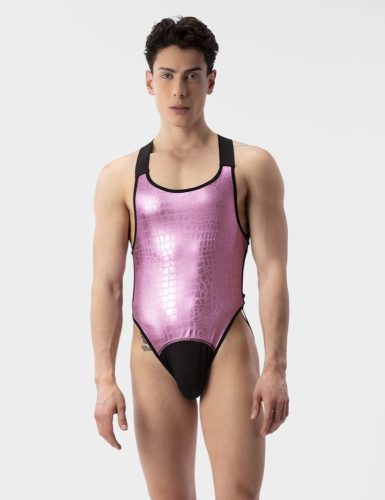 Costum din material argintiu cu textură de aligator. O ținută de petrecere cu o croială sexy, flatantă și detalii deliberate precum contrast neon.