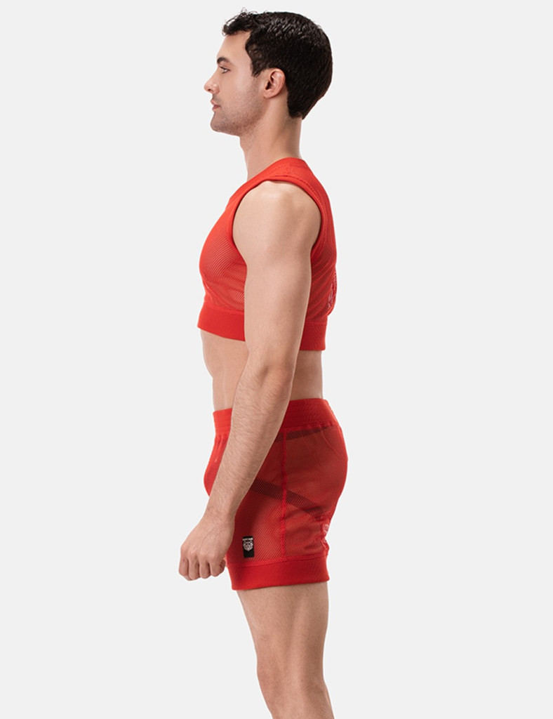 Crop top-ul este un design fără mâneci, realizat în întregime din plasă de plasă, oferind o senzație ușoară și respirantă. Silueta sa mulată are un decolteu rotunjit și un tiv scurt care se situează deasupra taliei pentru a evidenția trunchiul. Materialul semi-transparent îi conferă un aspect îndrăzneț, modern și ascuțit.