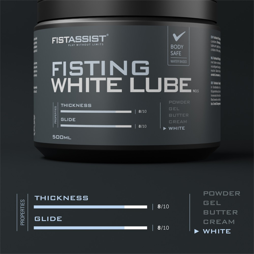 FistAssist Fisting White Lube anális használatra. Testmasszázshoz, és latex óvszerrel való használatra alkalmas. Használati utasítás: vigyen fel annyi síkosítót, amennyit csak szeretne a kívánt testrészekre. A síkosító használata előtt vigyen fel egy kis mennyiséget az alkarjára. Ha allergiás reakció lép fel, hagyja abba a használatát. Gyermekektől elzárva tartandó. Felnyitás után 12 hónapon belül fel kell használni.