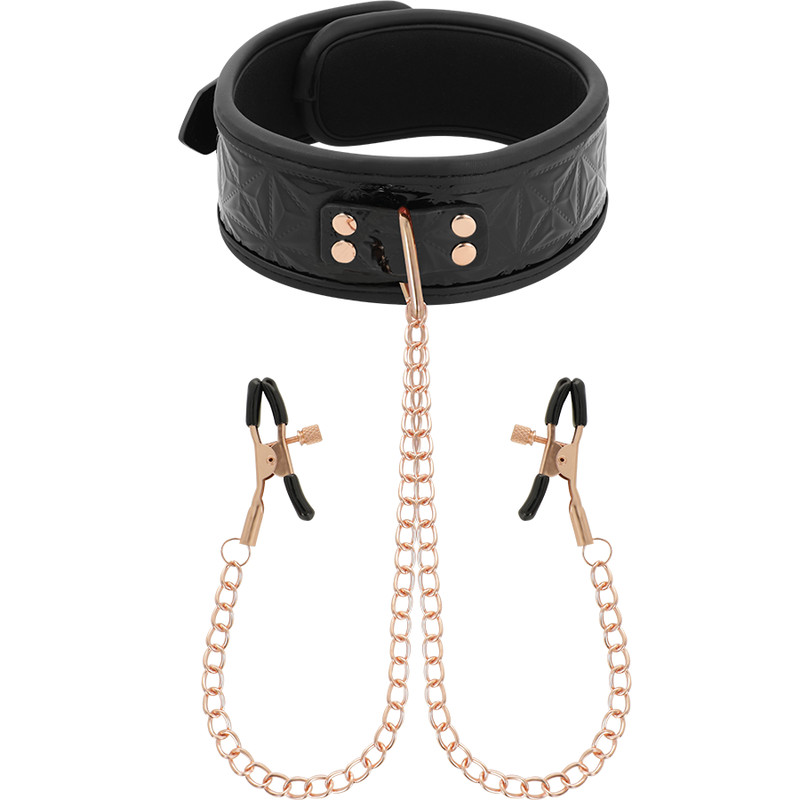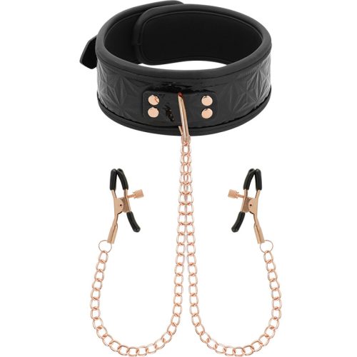 Készen állsz a maximális örömre?, ezüst lánccal kötve a mellbimbócsiferekhez. Izgalmas kötözőjáték, különösen nekik. A bilincsek és a gallér mind méret, mind feszültség tekintetében állítható. Tökéletes a mellbimbók és sok más érzékeny terület stimulálására.