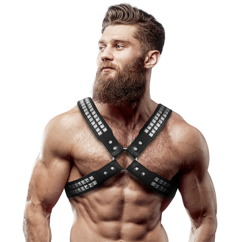 FETISS ALÁVETETTSÉG – FÉRFI KERESZTBE TETT MELLKAS ECO-BŐR HÁM SZEGECSEL