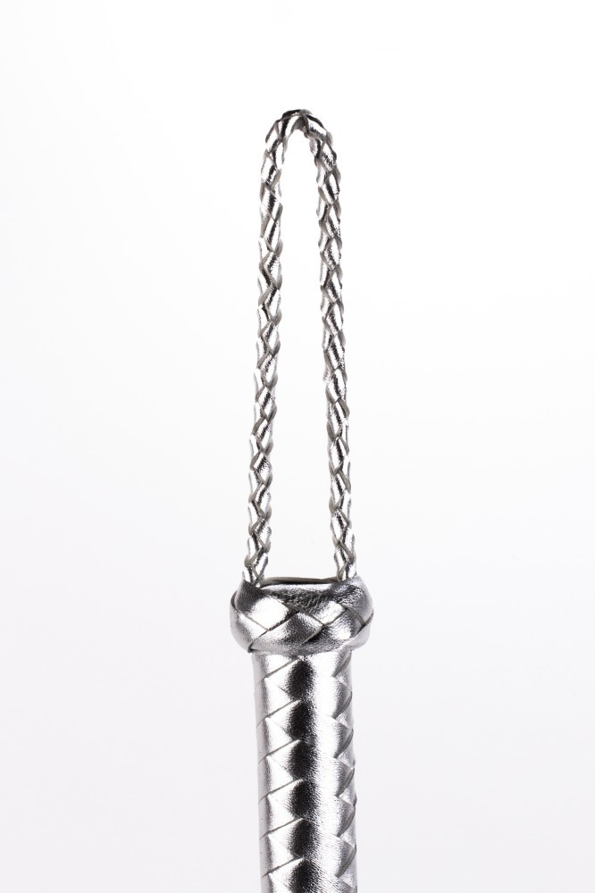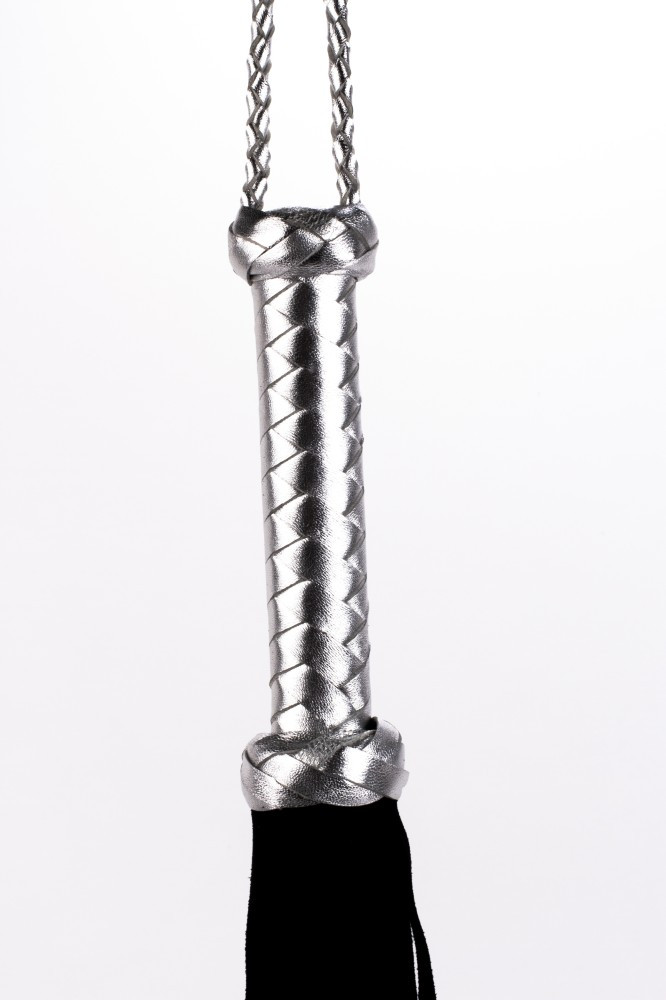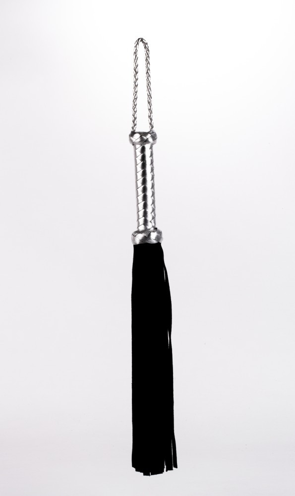 Flogger cu mâner din piele metalizată și cozi din piele întoarsă negru 18"