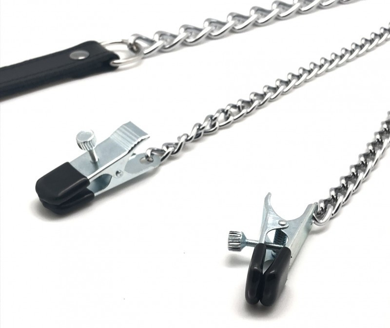 A csipeszek anyaga kiváló minőségű fém, amely nem irritálja a bőrt. A póráz vastag bőrből készült, biztosítva a maximális kényelmet és tartósságot. A termék méretei: a csipeszek 5 cm hosszúak, míg a póráz hossza 1 méter, ideális minden játékhoz.