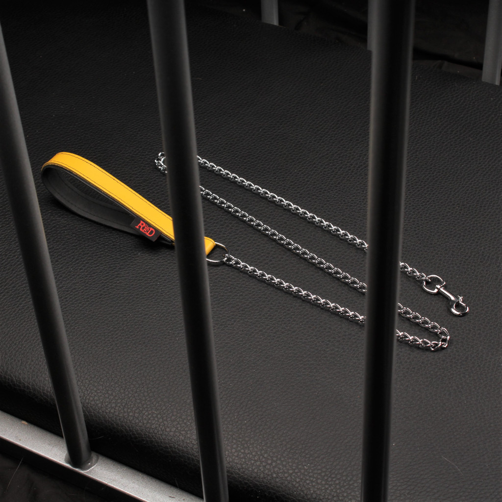 Fedezd fel a prémium stílust és biztonságot a luxus bőrkészítésű póráz segítségével! A 1 méteres fém lánc és a 19 cm-es, középen sárga csíkkal díszített bőrfogantyú tökéletes kombináció a kényelem és a tartósság érdekében. Rögzítsd könnyedén a hámot vagy nyakörvet a karabinert használva! Kényeztesd kedvencedet az elegancia és funkcionalitás maradéktalan harmóniájával!