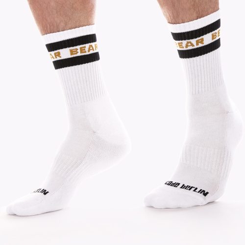 Fedezd fel a stílusos szórakozást a Barcode Berlin fehér zoknijával! A fekete csíkok és a barna "Bear" felirat figyelemfelkeltő kombinációja, amely garantáltan feldobja a megjelenésedet bulikon. Merj különbözni, merj csábítani!