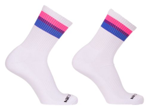 • Stílusos dizájn: A fehér zoknikon diszkréten megjelenik a bisex zászló, amely egyszerre játékos és elegáns.