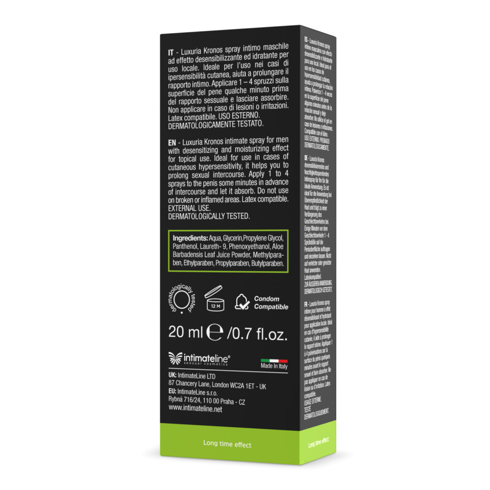 Helyi használatra szánt, érzéstelenítő és hidratáló hatású férfi késleltető spray, amelyet a makk külső felületére kell felvinni. Néhány perccel a szex előtt vigyen fel 2-4 fújásnyi Kronos Delay Spray-t a makkra, és hagyja felszívódni.