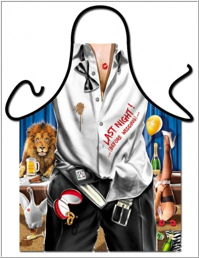 Șorț amuzant, cu model, pentru bărbați. Poate fi un accesoriu pentru petreceri de burlaci și burlăcițe, gătit în weekend.
