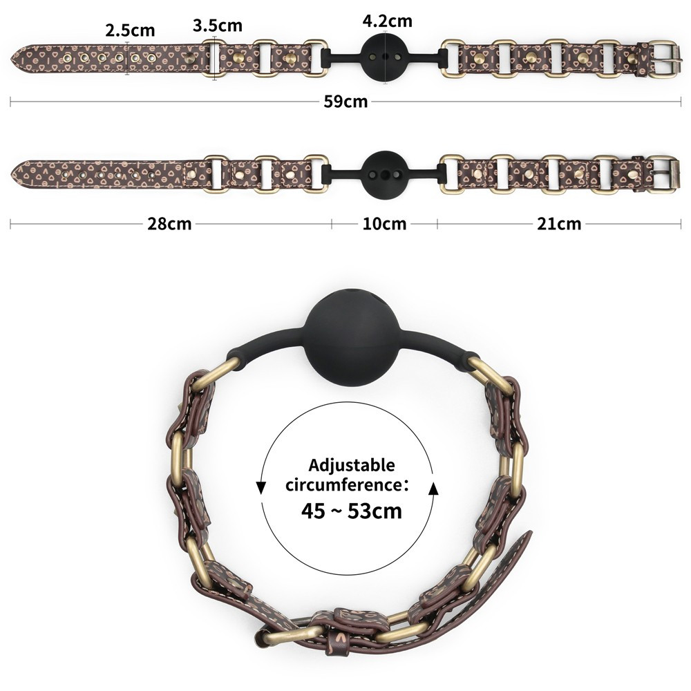 A Rebellion Reign Ball Gag Calitate premium material pe care șase țepi antici din bronz sunt intercalați cu un maro bogat piele sintetică, care oferă un strat suplimentar de farmec unic și indică aspectul brandului spirit rebel. Produsul poate fi reglat între 45 și 53 cm în diametru.