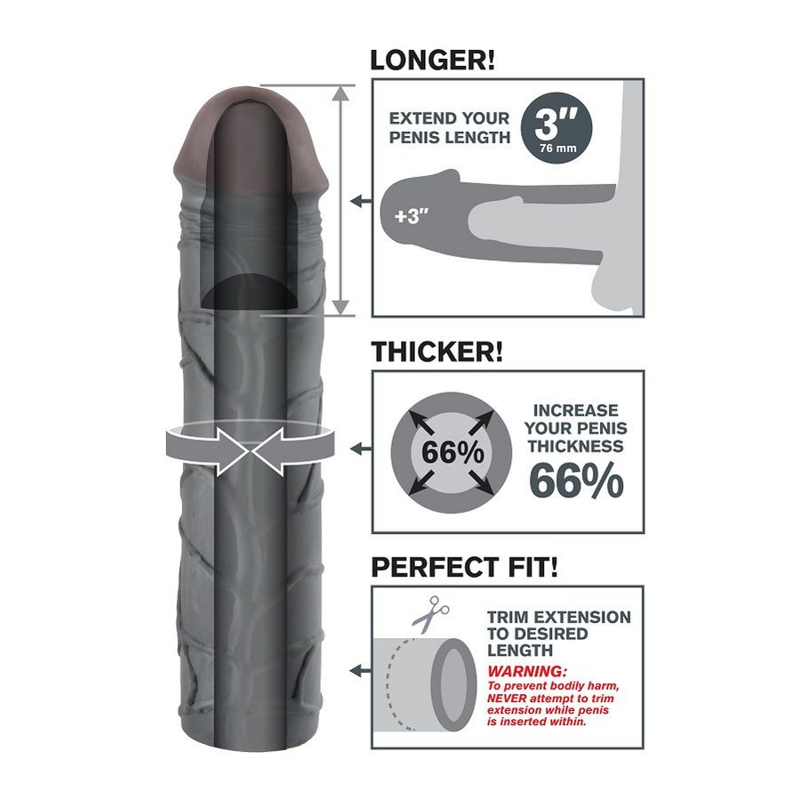 A Mega 3" kiterjesztés egy testreszabható kiterjesztés, amely könnyen levágható az alapon, hogy tökéletesen illeszkedjen. Nagyon rugalmas, hogy a legtöbb méretet befogadja, és elég szoros, hogy tovább bírja. A partnered mélyebb behatolást élvez a hegyén lévő 3" hosszabbítással, míg az ultra-élethű nyél 66%-kal vastagabb lesz minden irányban. A puha Fanta Flesh anyag pont olyan, mint egy második bőr, megadva neked a hosszúságot, a vastagságot és a magabiztosságot, amire szükséged van a szerelmedhez.