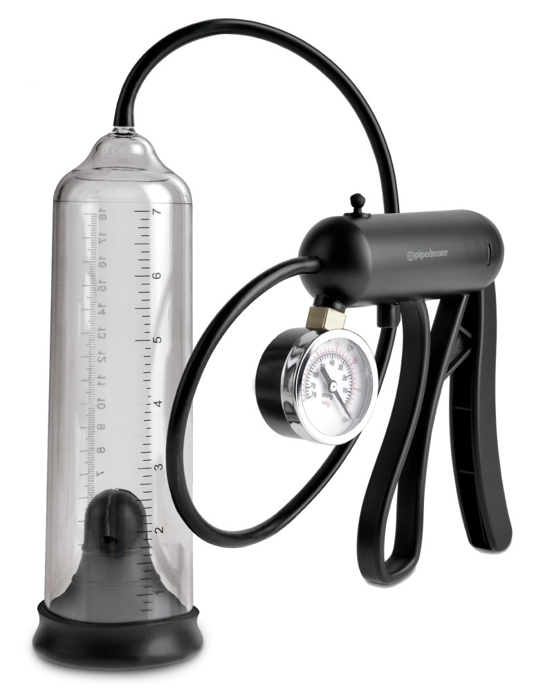 Férfiaknak ajánlott, hímvesszőre helyezendő henger alakú készülék, mely a hozzá kapcsolt pumpával fokozza annak vérbőségét. Egyszerűen helyezze be a péniszét a vákuumhenger csövébe, nyomja össze az EZ-markolat fogantyúját, és nézze meg, hogy az fokozatosan növekszik.A puha PVC hüvely tökéletesen szoros tömítést képez a bőrrel szemben, és erős vákuumot hoz létre a kamrában, ami erekciót eredményez. Az átlátszó vákuumhenger láthatóvá teszi az etredméynt, míg a könnyen leolvasható mérőeszközzel megtudhatja, hogy mekkora nyomást pumpált.Ha elérte a kívánt méretet, egyszerűen nyomja meg a gyorskioldó pisztolyt a fogantyú tetején, hogy azonnal enyhítse a nyomást, és máris készen áll a játékra!Tisztítása : minden használat előtt és minden használat után a hengert langyos szappanos vízzel és segédeszköz tisztítóval kell lemosni.