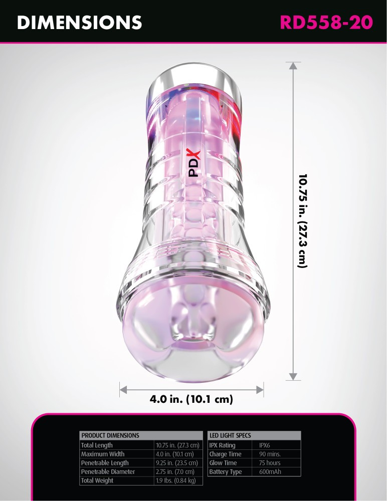 Kiváló minőségű anyagból készített, vizuális stimuláció fokozására is tervezett, átlátszó, LED-es világítással felszerelt maszturbátor, melynek betétje gömbökkel van ellátva. Használatával az aktus közbeni önkontroll nagy mértékben fejleszthető, így annak ideje jelentősen növelhető.