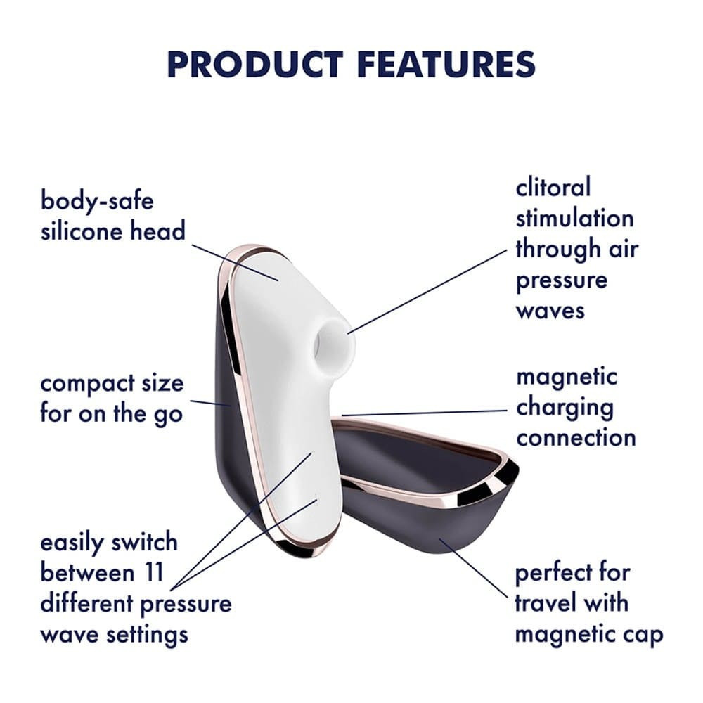 Un stimulator clitoridian cu undă aeriană realizat dintr-un material de calitate superioară, prietenos cu pielea, ușor de controlat, cu 11 funcții de aspirație, care poate fi plasat într-o carcasă ce se închide cu un magnet, jumătate din acesta fiind stimulatorul propriu-zis. După cum sugerează și numele, poate fi luat oriunde și oricând.