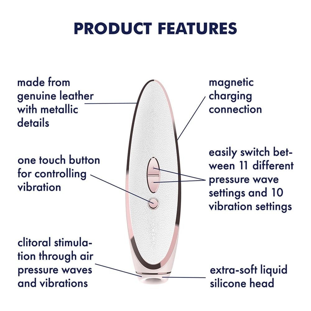 Egyszerűen vezérelhető, valódi bőr borítású, luxus minőségű és kivitelű, ergonómiailag tervezett, könnyen kezelhető, léghullámos és vibrációs működésre is kialakított izgató. 11 léghullámos és 10 rezgési fokozattal rendelkezik, a stimulációs módok egymástól függetlenül is használhatóak.