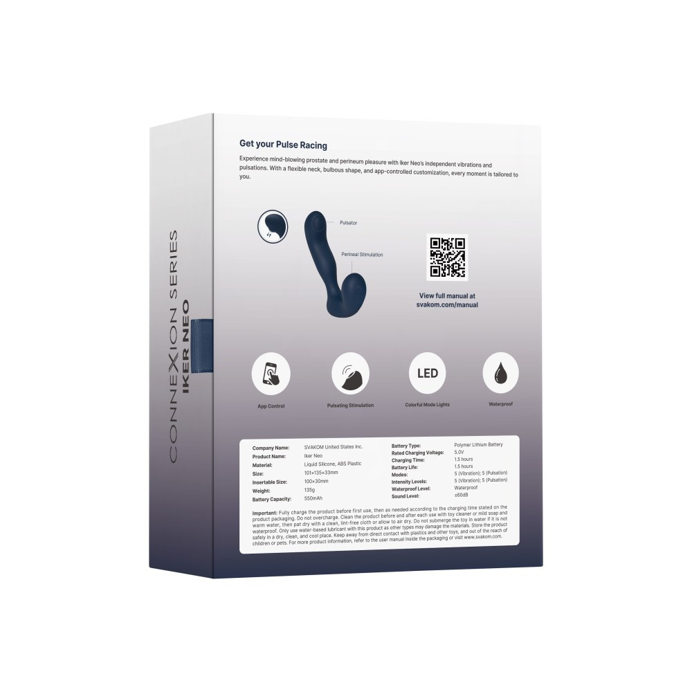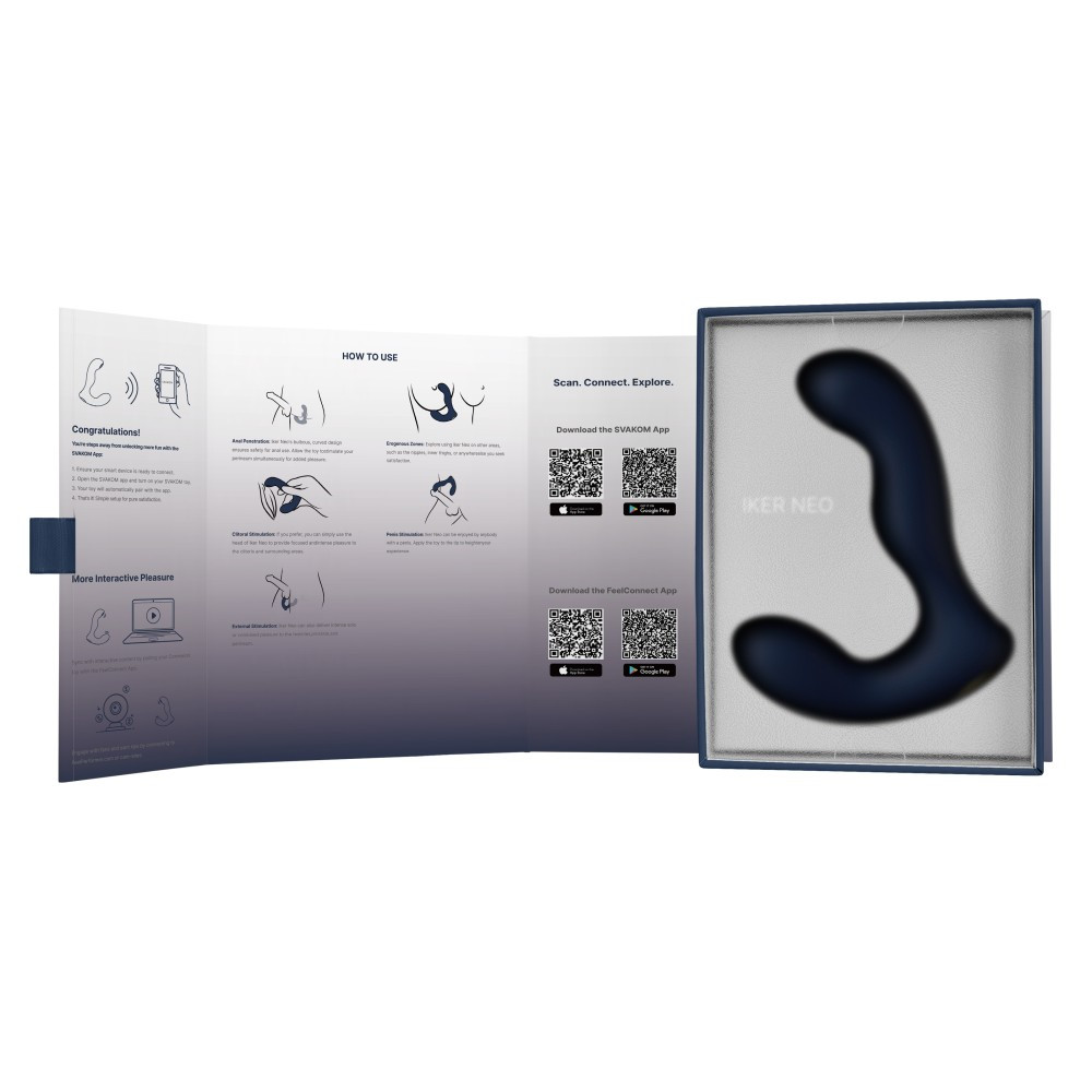 Az Iker Neo egy interaktív, pulzáló prosztata vibrátor, középhaladó és haladó felhasználók számára, amely ideális, gömbölyű görbékkel rendelkezik a teltebb érzésért, és rugalmas nyakkal a könnyebb pozicionálásért. Fedezze fel az 5 vibrációs módot és intenzitást, míg a szár feje 5 független pulzációs beállítást kínál a mély, célzott stimulációért. Élvezd a szivárványos utazást, miközben a színváltó fények jelzik a vibrációs módokat. Az élvezetes és praktikus Iker Neo vízálló kivitelű, USB-tölthető, utazási zárral, memóriafunkcióval és akkumulátorjelzővel rendelkezik. Az SVAKOM Connexion sorozat részeként az Iker Neo alkalmazásvezérelt, így testreszabhatja a beállításokat, távolról is játszhat, és szinkronizálhatja interaktív felnőtt videókkal és webkamerás oldalakkal. Az Iker Neo másodpercek alatt párosítható az SVAKOM alkalmazással. Hozzáférhet a bónusz előre beállított módokhoz, vagy saját módokat hozhat létre ujjmozdulatokkal, zenével vagy környezeti hangokkal. Emellett szöveges csevegést, videohívást vagy a vezérlés megosztását is használhatja bármilyen távolságból.